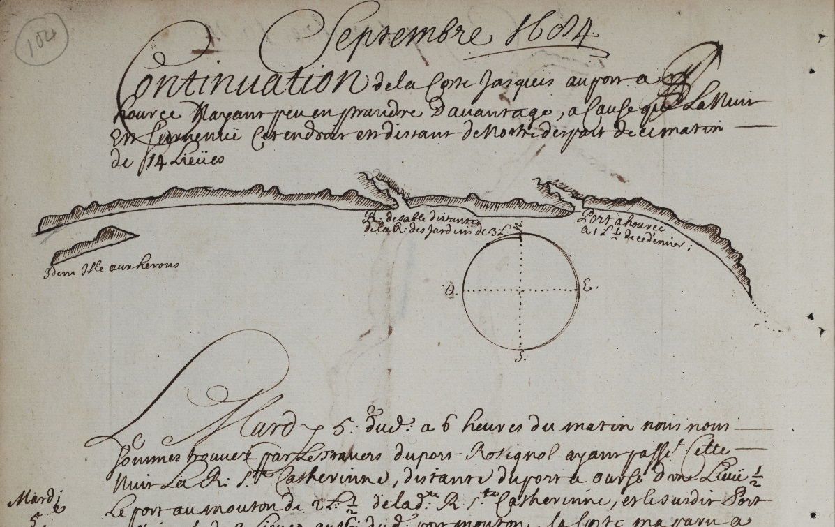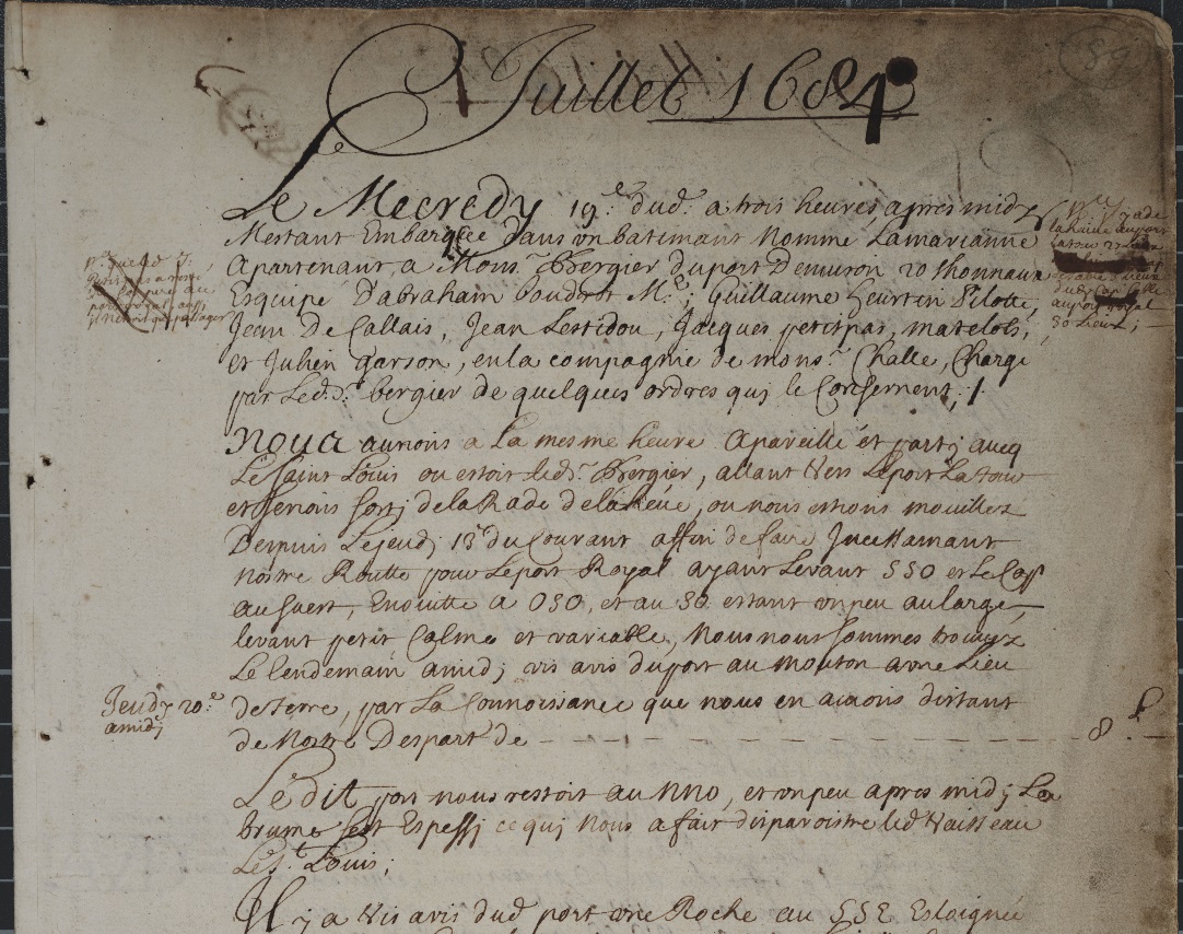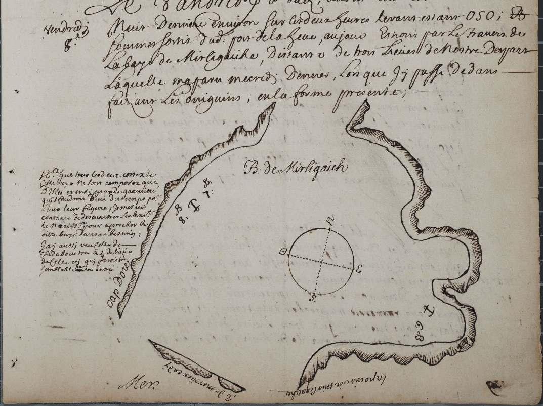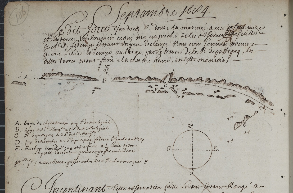 This not a rutter, as per say, but a manuscript journal of the ship “Marianne” dated 1684 (not 1604). That ship departed on an expedition along the Atlantic coast of Nova Scotia and parts of New Brunswick situated on the Bay of Fundy, July 19, 1684 – September 14, 1684. The ship was accompanied at first by another ship, the “St. Louis.” The owner of the boats, who also organized the expedition was Clerbaud Bergier, a French protestant who, in April 1684, was appointed lieutenant for the king in Acadia for three years. The crew of the Marianne consisted of Abraham Boudrot (Captain, most probably the ancestors of all Acadian Boudreaus), Guillame Guertin (pilot), Jean de Callais, Jean Lestidou, Jacque Petitpas Matelot, Julien Garson, and M. Challe.