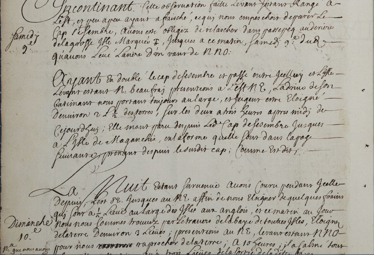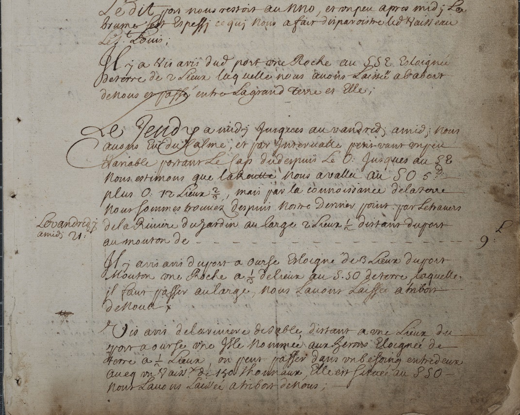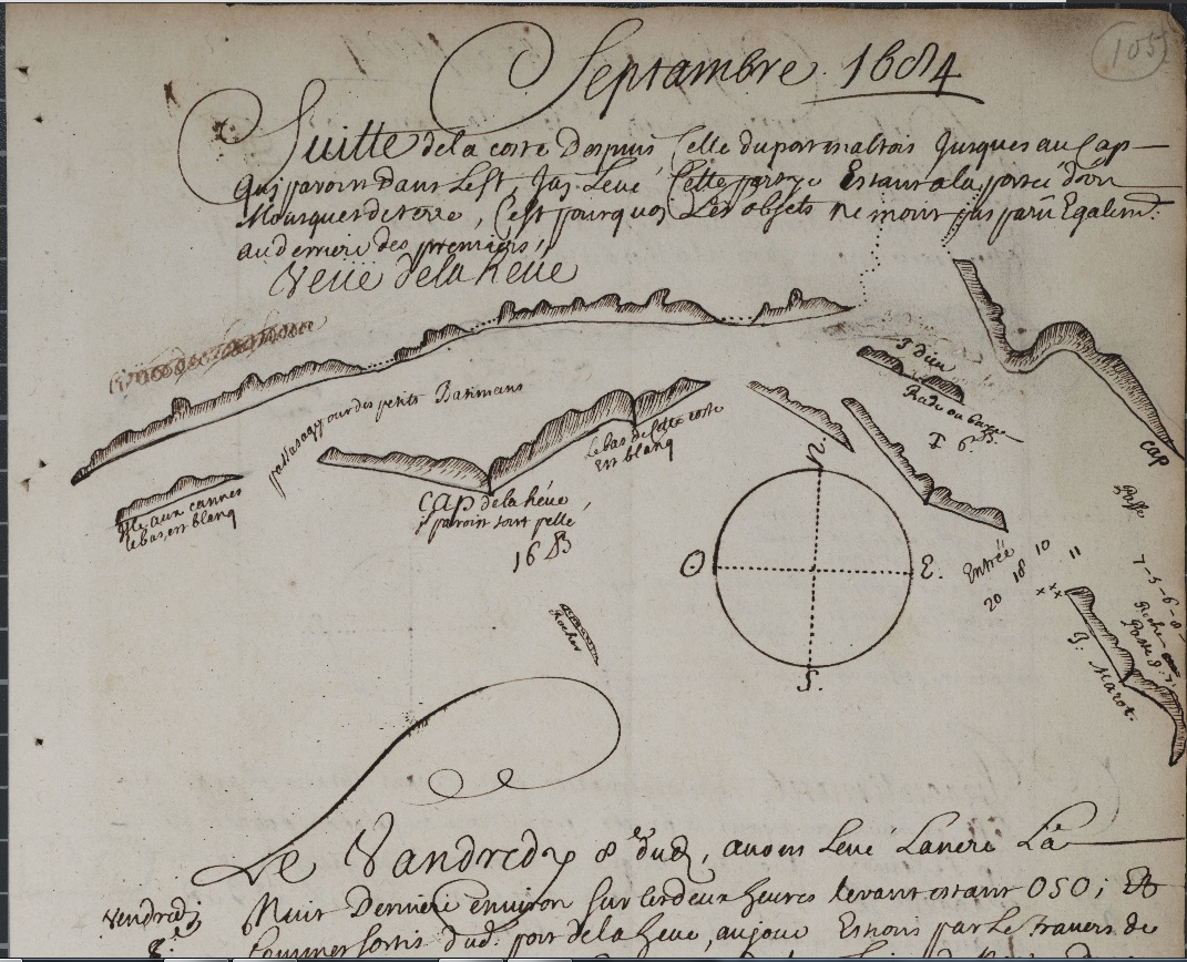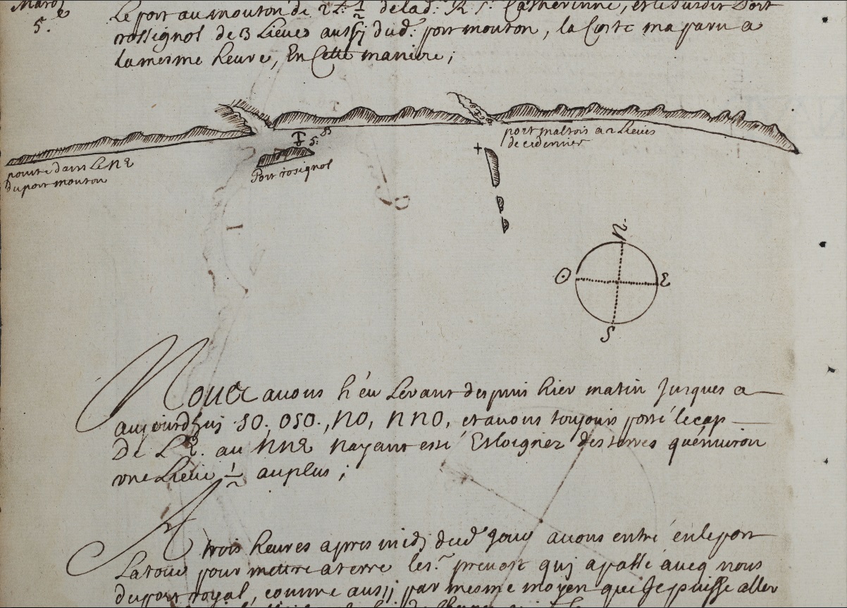 This not a rutter, as per say, but a manuscript journal of the ship “Marianne” dated 1684 (not 1604). That ship departed on an expedition along the Atlantic coast of Nova Scotia and parts of New Brunswick situated on the Bay of Fundy, July 19, 1684 – September 14, 1684. The ship was accompanied at first by another ship, the “St. Louis.” The owner of the boats, who also organized the expedition was Clerbaud Bergier, a French protestant who, in April 1684, was appointed lieutenant for the king in Acadia for three years. The crew of the Marianne consisted of Abraham Boudrot (Captain, most probably the ancestors of all Acadian Boudreaus), Guillame Guertin (pilot), Jean de Callais, Jean Lestidou, Jacque Petitpas Matelot, Julien Garson, and M. Challe.