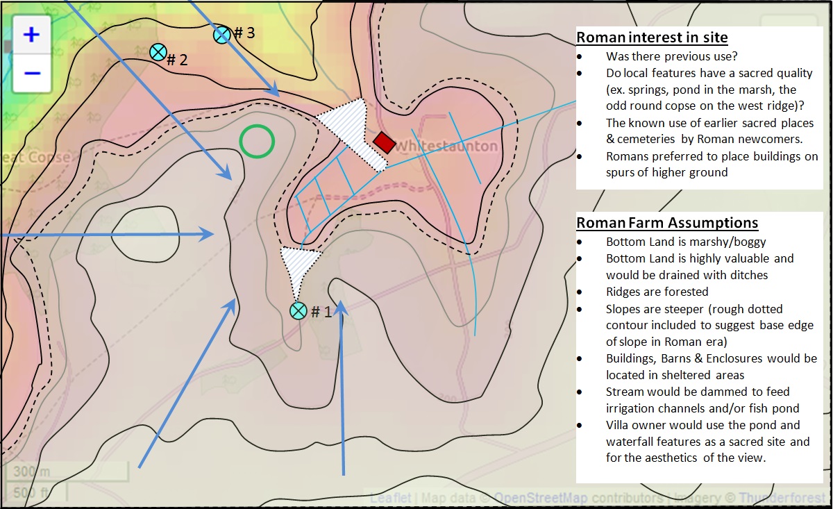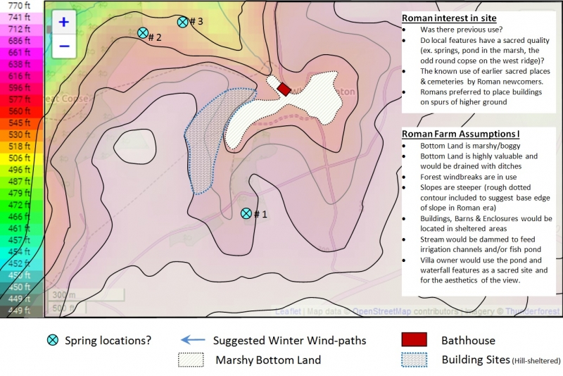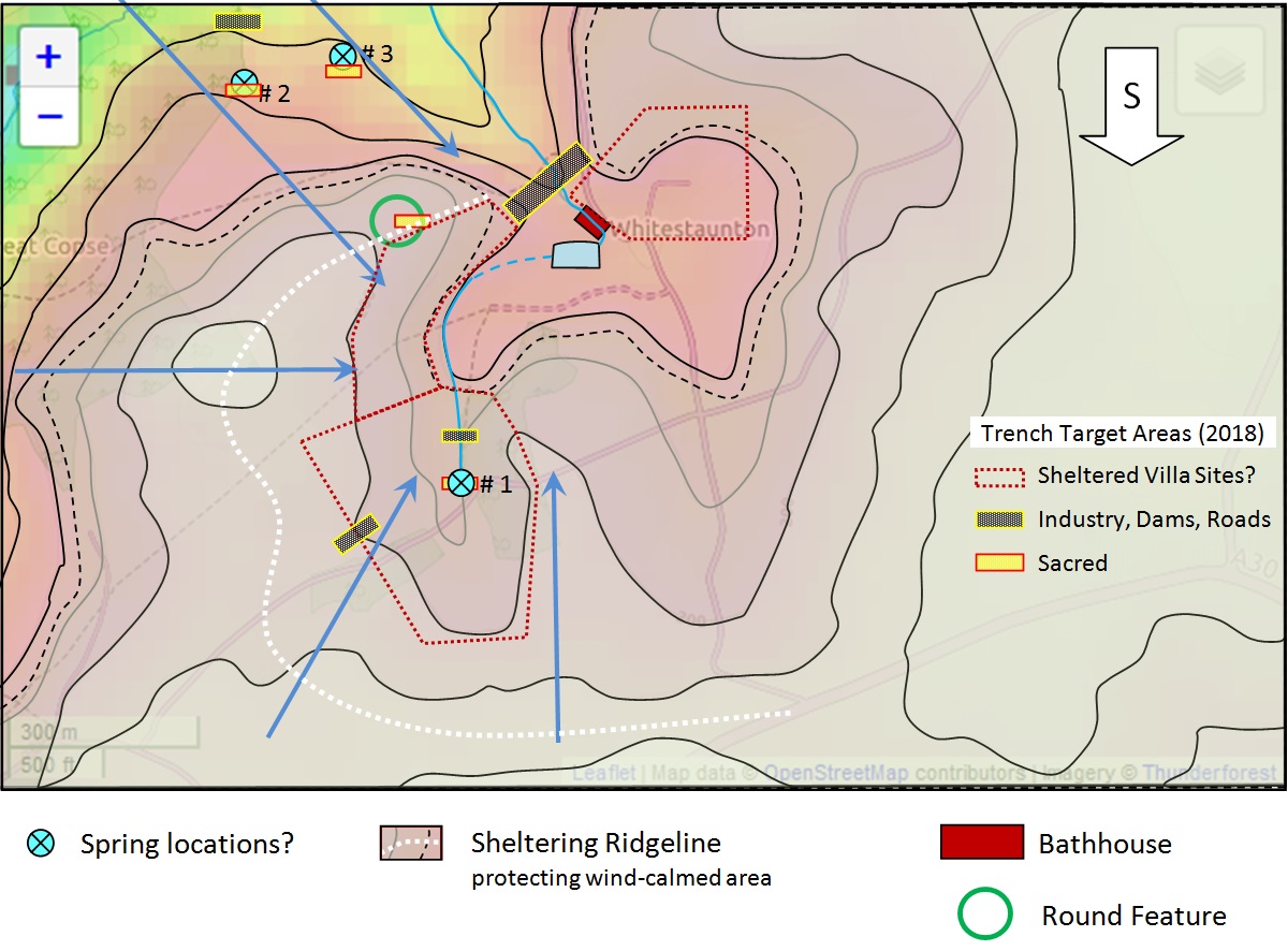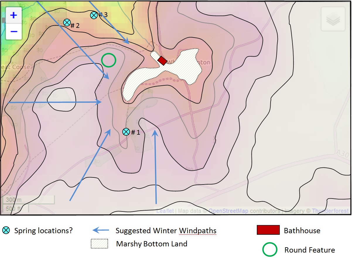 Topography shapes our use of a landscape. The Celts worshiped at sacred forest groves and at water places. The presence of marshy land in a pocket valley fed by a spring gives rise to the speculation that this might produce conditions for veneration by the local Celtic confederacy, the Durotriges: a spring, stream, marsh, pond, enclosed in a small valley cupped by smoothly sloping ridges. The round copse on the slope to the west is also intriguing [see “Round Copse” page].