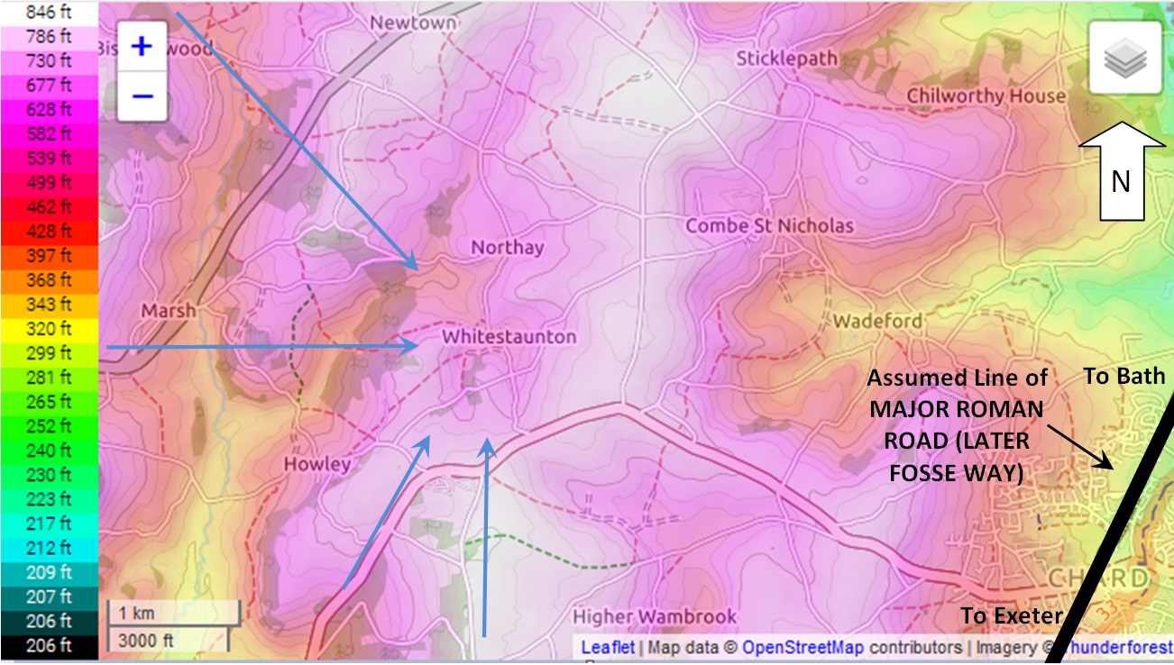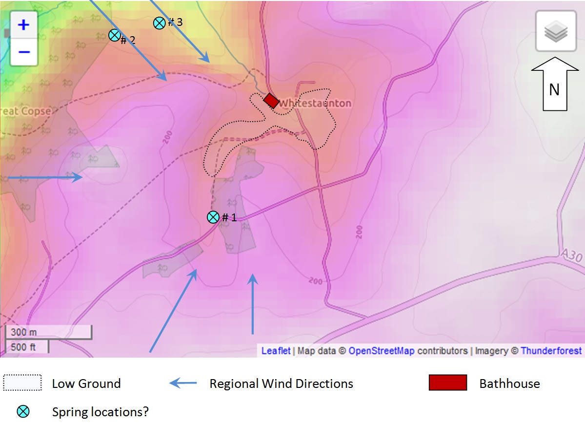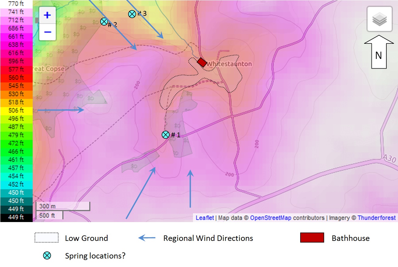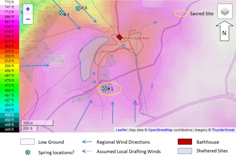 Topography shapes our use of a landscape. The Celts worshiped at sacred forest groves and at water places. The presence of marshy land in a pocket valley fed by a spring gives rise to the speculation that this might produce conditions for veneration by the local Celtic confederacy, the Durotriges: a spring, stream, marsh, pond, enclosed in a small valley cupped by smoothly sloping ridges. The round copse on the slope to the west is also intriguing [see “Round Copse” page].